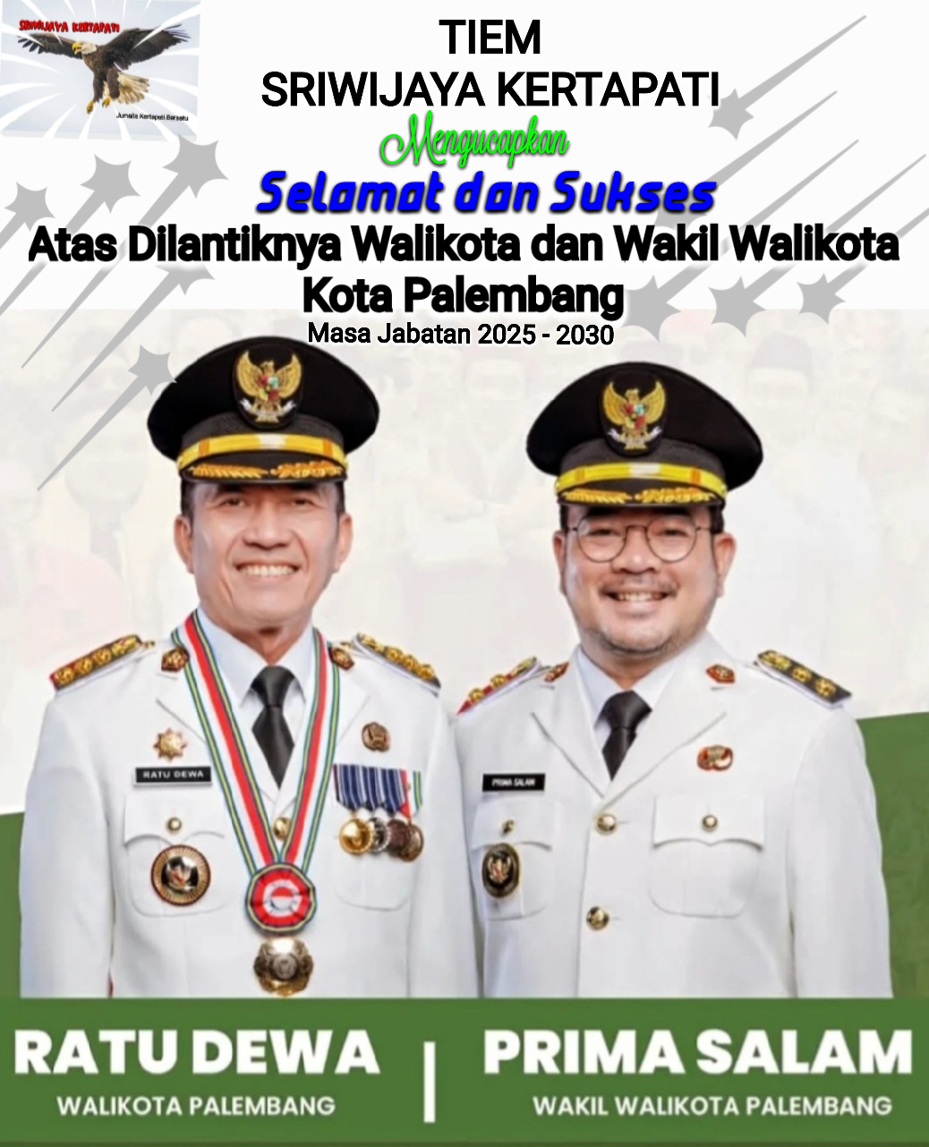 “Kami Tiem Sriwijaya Kertapati, gabungan jurnalis Kertapati mengucapkan selamat dan sukses kepada Bapak Ratu Dewa dan Bapak Prima Salam menakhodai Kota Palembang. Semoga diberikan kesehatan dan kekuatan untuk menjadikan Kota Palembang jauh lebih baik lagi,” kata Iman Vahlevi yang akrab sapa Levi Panglima Kemang. Jumat (21/02/2025).